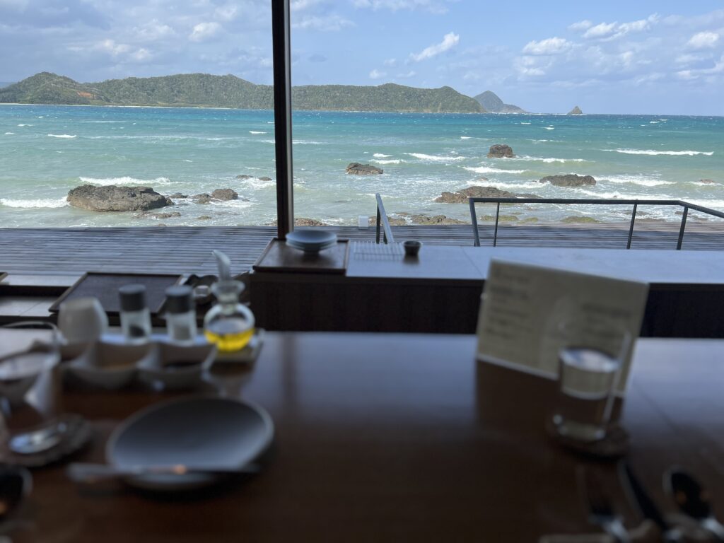 宿泊プランは「素泊まり」「朝食付き」「朝夕食付き」とあり、私たちは「朝食付き」選びました。朝食も地元の素材を使用した身体に優しいメニュー。目の前に広がる海の色がとても綺麗でした。