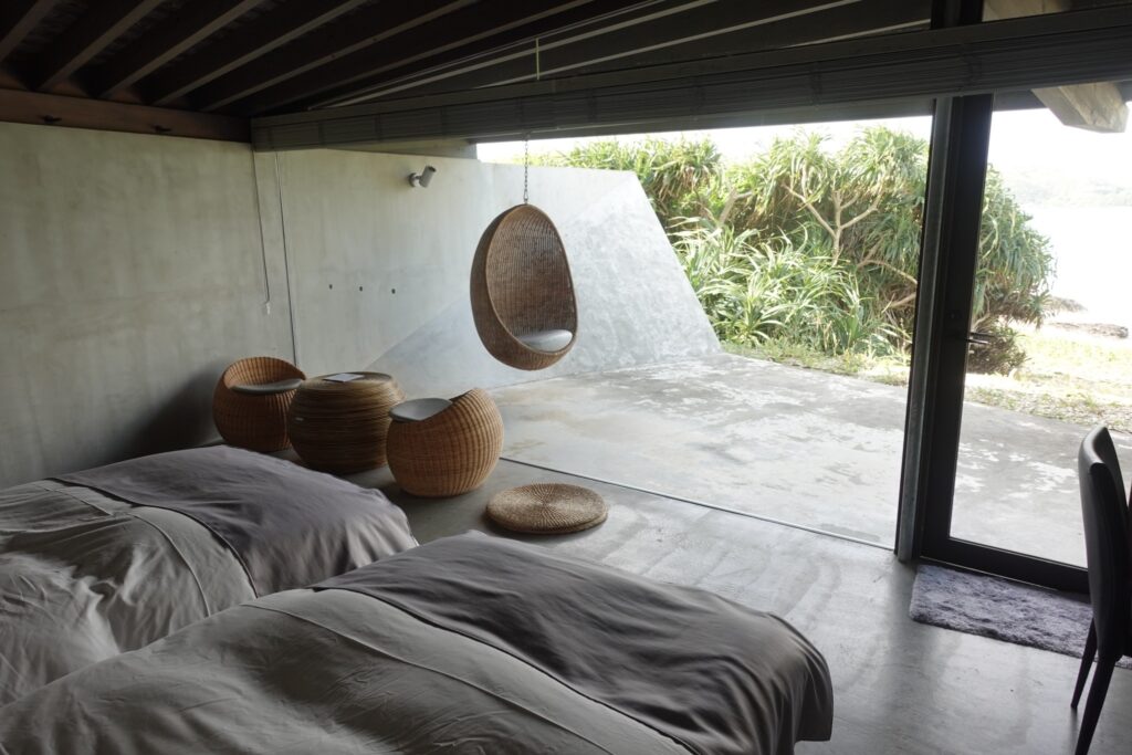 今回泊まったのはヴィラタイプで全13棟のヴィラが奄美北部の海岸沿いに位置しています。目の前にはプライベートビーチ(徒歩1分)があり、部屋にはテレビなどもなく自然の虫の声や波の音などを体感できる宿です。